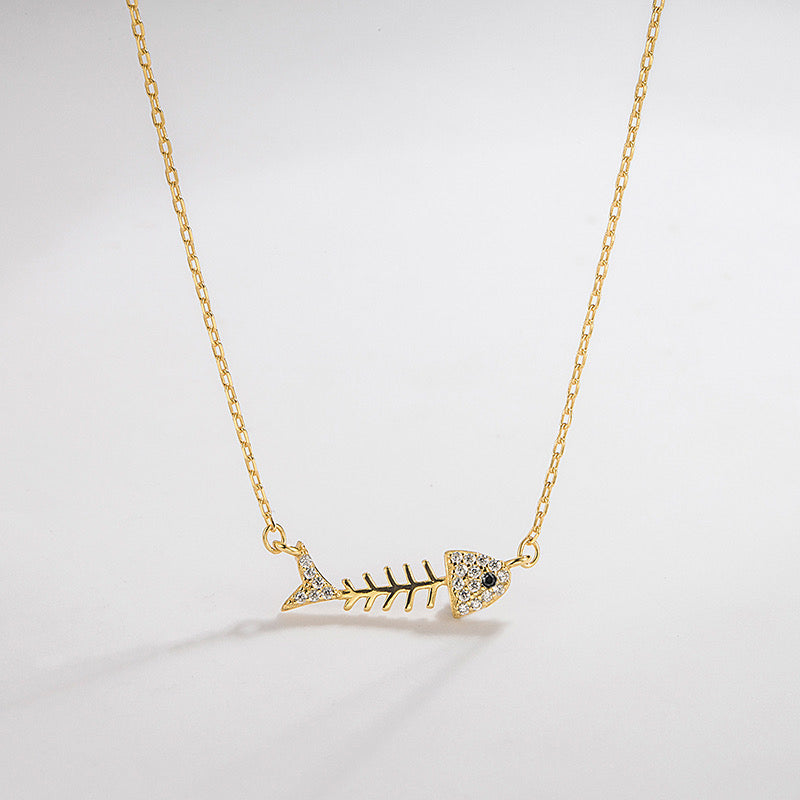 The Fishbone Gold Necklace blends modern elegance with playful symbolism. Crafted from premium 925 sterling silver and finished with 18K real gold plating, this delicate fishbone pendant is adorned with shimmering zircon stones for a refined sparkle.
