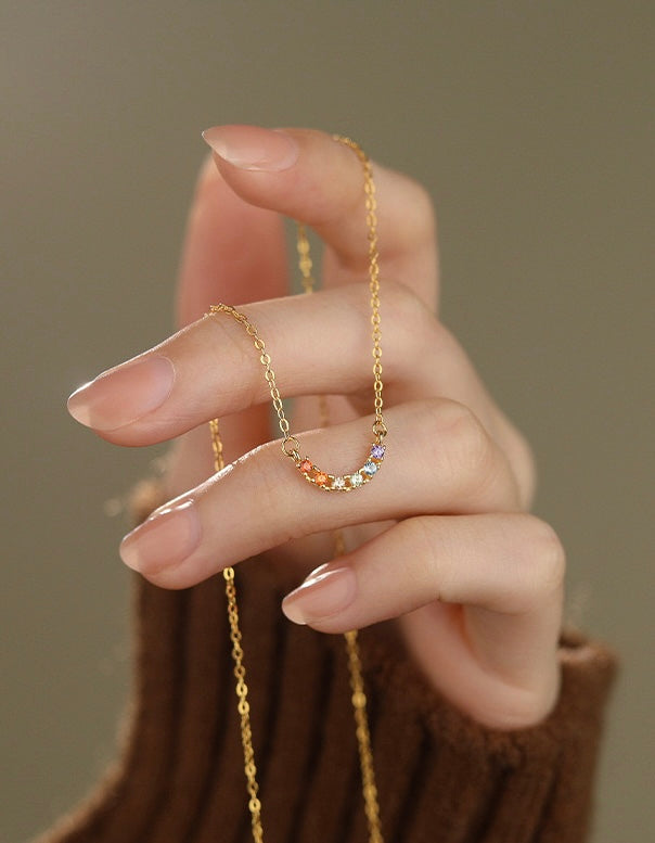 A delicate expression of joy and color, this rainbow smile necklace is crafted in S925 sterling silver and finished with vibrant zircon stones. Designed to sit gracefully along the clavicle, it brings a subtle pop of color while maintaining a refined, minimal aesthetic. Perfect for everyday wear or thoughtful gifting.